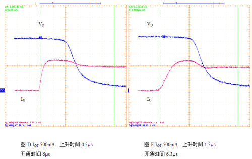 下图D、E分别为触发脉冲幅值500mA上升时间0.5µs、 1.5µs时的元件开通电压波形。